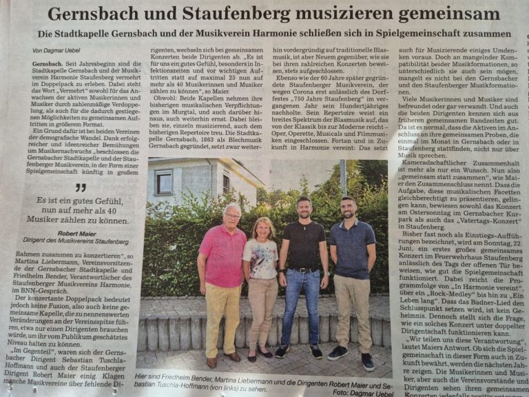 Wir blicken zurück auf die Gründung unserer Spielgemeinschaft mit der Stadtkapelle Gernsbach und erste gemeinsame Zusammenkünfte, Proben und Auftritte.